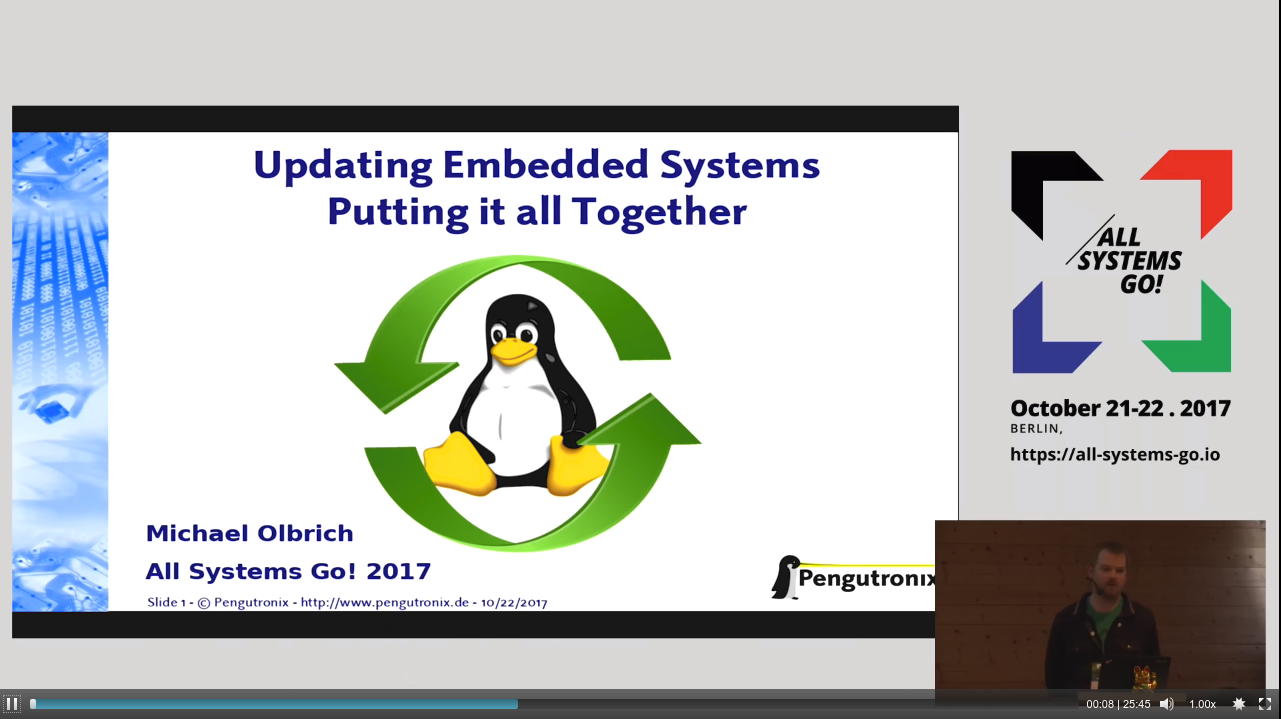 At the All Systems Go conference in Berlin, Michael Obrich reported at 2017-10-22 about "Updating Embedded Systems - Putting it all together", based on the experiences of the Pengutronix integration team.