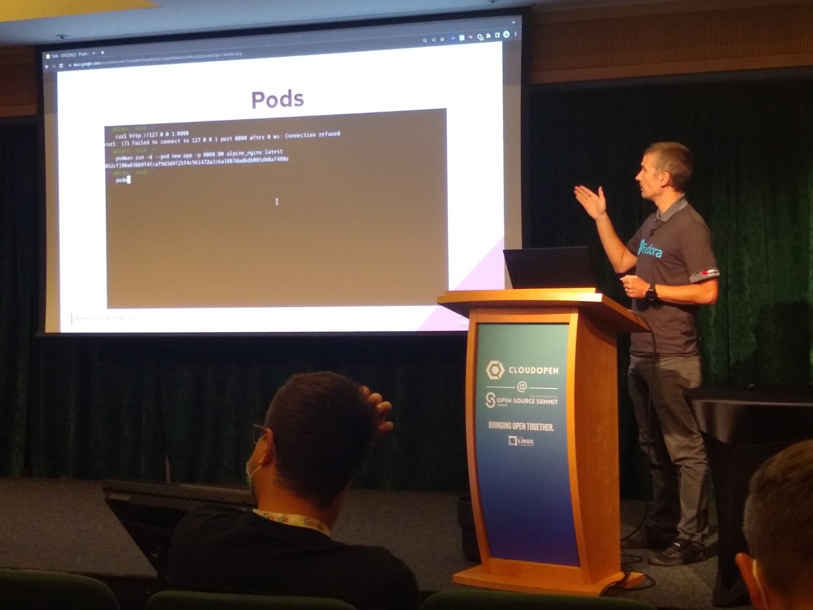 In my next talk, Pierre Blanc (Red Hat) talked about the podman container (or better: pod) manager. It is rootless, daemonless and thus aims to be secure by design. Pierre started with the history of containers, then started to show how to search for container images. Once one has found an appropriate container image, one can start it, connect to it and expose network ports. To get access to data, volumes can be mounted inside the container. A good thing with user containers is that it is not necessary to run containers as root.
