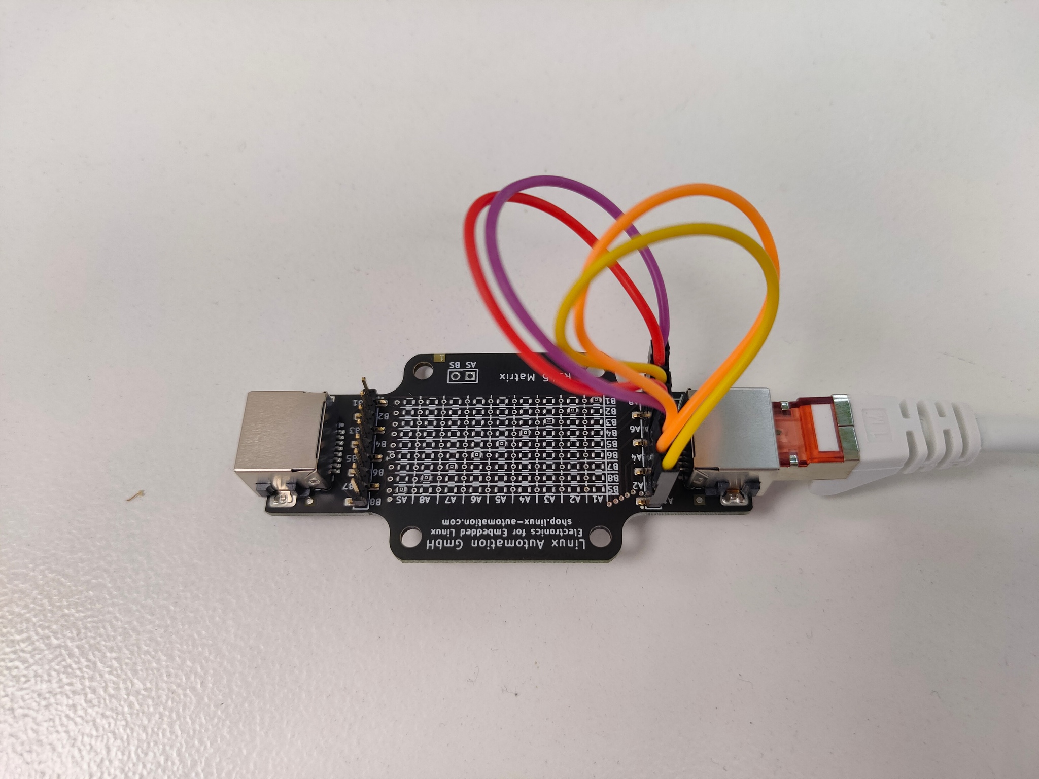 To connect the individual pairs two Linux Automation RJ45-Matrix boards are used as breakouts for the RJ45-connectors. The jumper cables are connected in such way that they actually use the twisted pairs inside the S/FTP cable.