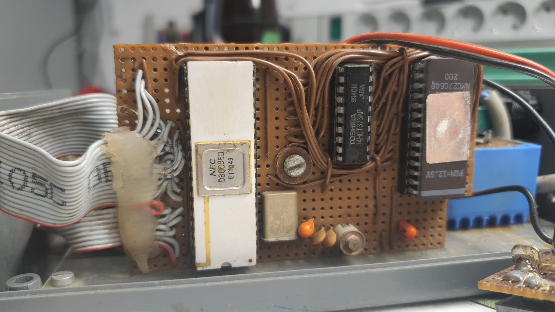 - For the external EPROM I had to add a latch, to separate the multiplexed address and data buses. This was done by the 74HCT273 latch in the picture.